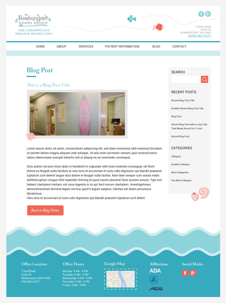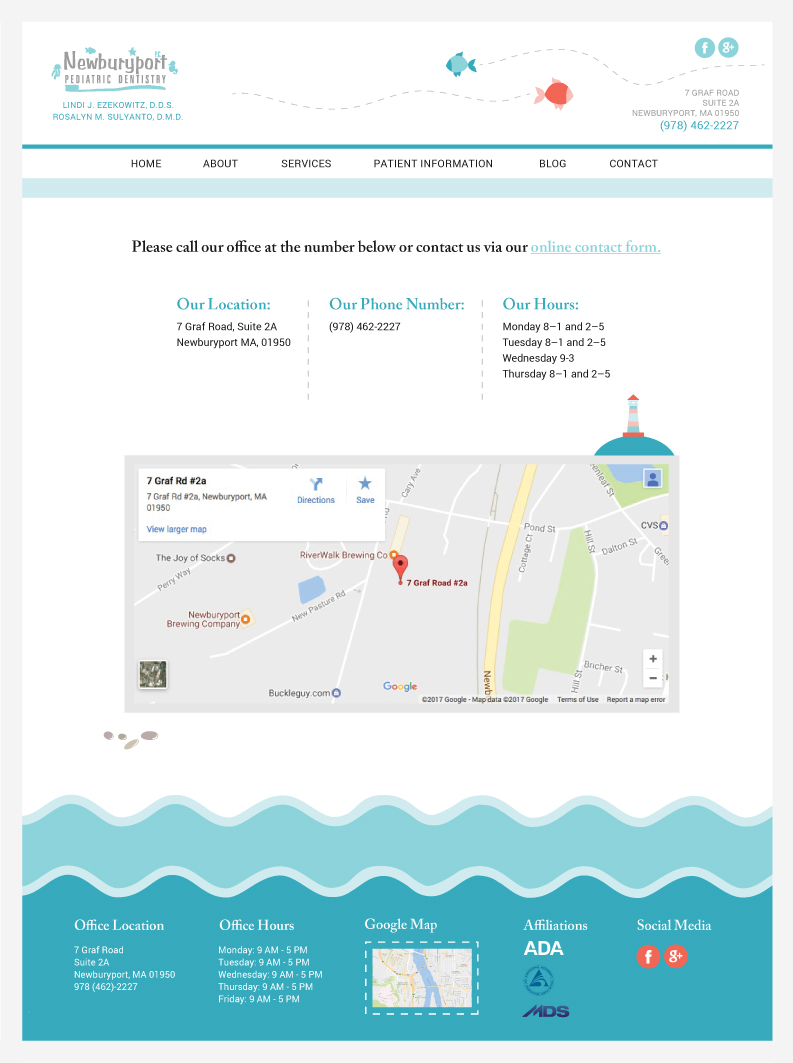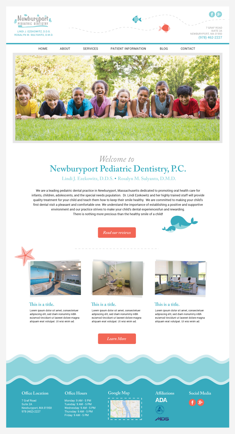 Designed website layouts for the clients of NJ-based dental web design company. The example shown here is for a pediatric dental office in Newburyport MA.